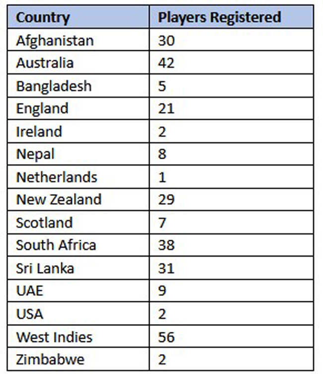 Country-wise breakdown of 283 overseas players who have registered: Afghanistan (30), Australia (42), Bangladesh (5), England (21), Ireland (2), Nepal (8), Netherlands (1), New Zealand (29), Scotland (7), South Africa (38), Sri Lanka (31), UAE (9), USA (2), West Indies (56), Zimbabwe (2).